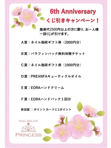 つくばみらい市にあるネイルサロンプリンセスです。 いつもネイルサロンプリンセスにご来店いただきましてありがとうございます。 おかげさまで「nailsalon PRINCESS」は3月3日をもちましてオープン6周年を…