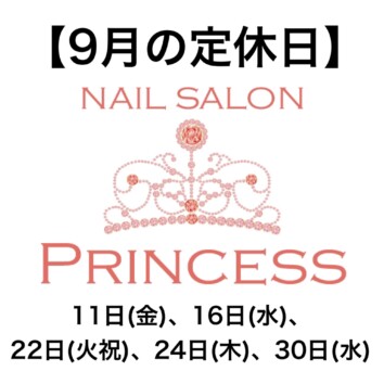 みらい平にあるネイルサロンプリンセスです。 いつもネイルサロンプリンセスにご来店いただきましてありがとうございます。 9月の定休日のお知らせです。 9月は11日(金)、16日(水)、22日(火祝)、24日(…