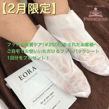 フットの角質ケア(¥2500)をされたお客様へ、ご自宅でお使いいただけるフットパックシート1回分をプレゼント! ・肌細胞の成長や増殖に効果的なEGF配合 ・ハリと潤いに効果のあるコラーゲン配合 ・美白や老化…